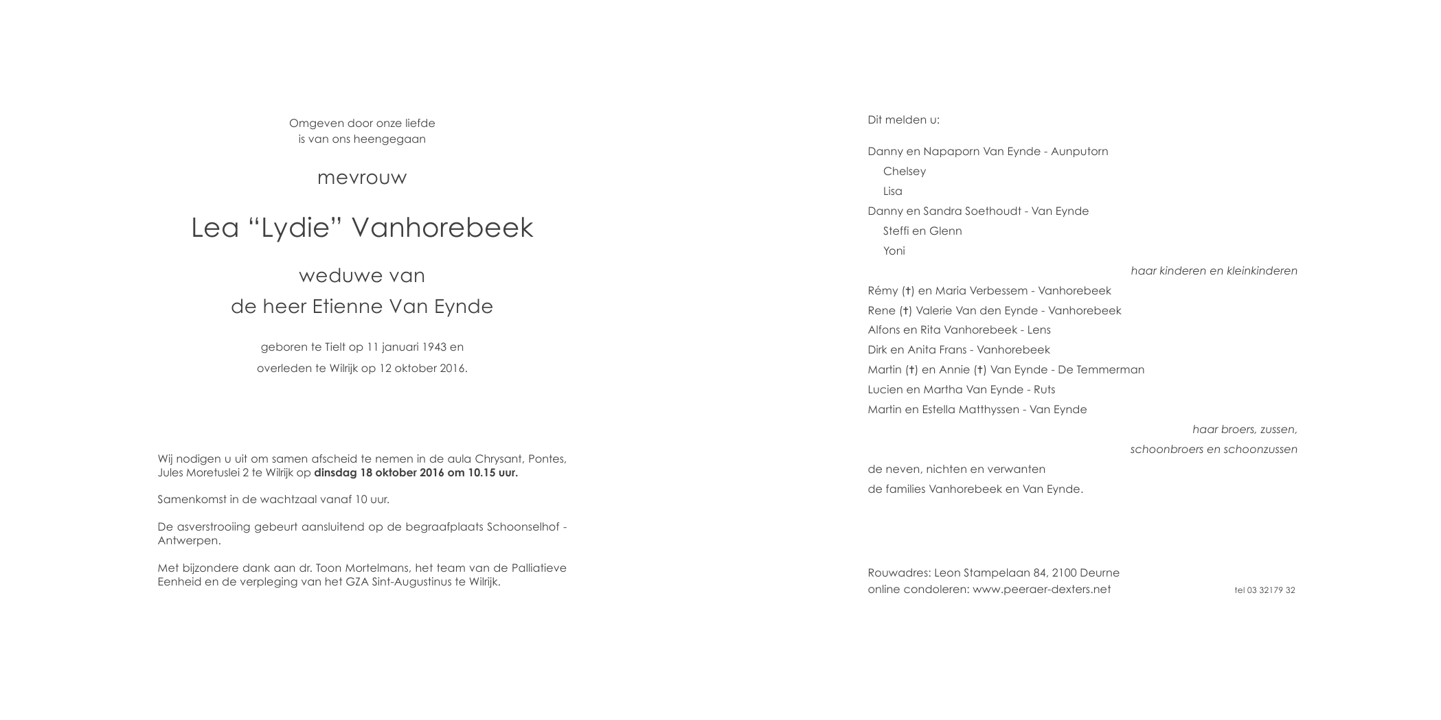 Overleden te Wilrijk (Antwerpen) (2610) op donderdag 13 oktober 2016 op 73-jarige leeftijd