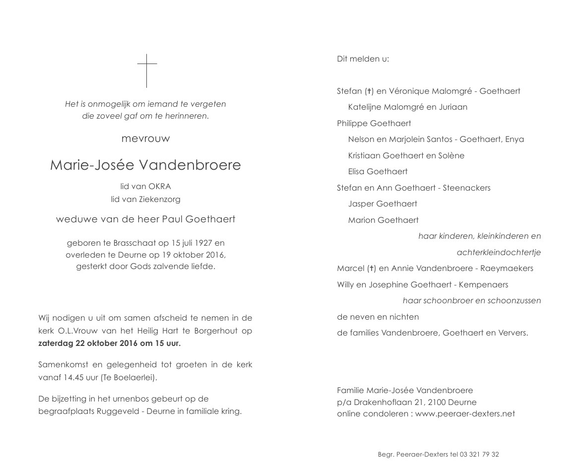 Overleden te Deurne (Antwerpen) (2100) op woensdag 19 oktober 2016 op 89-jarige leeftijd