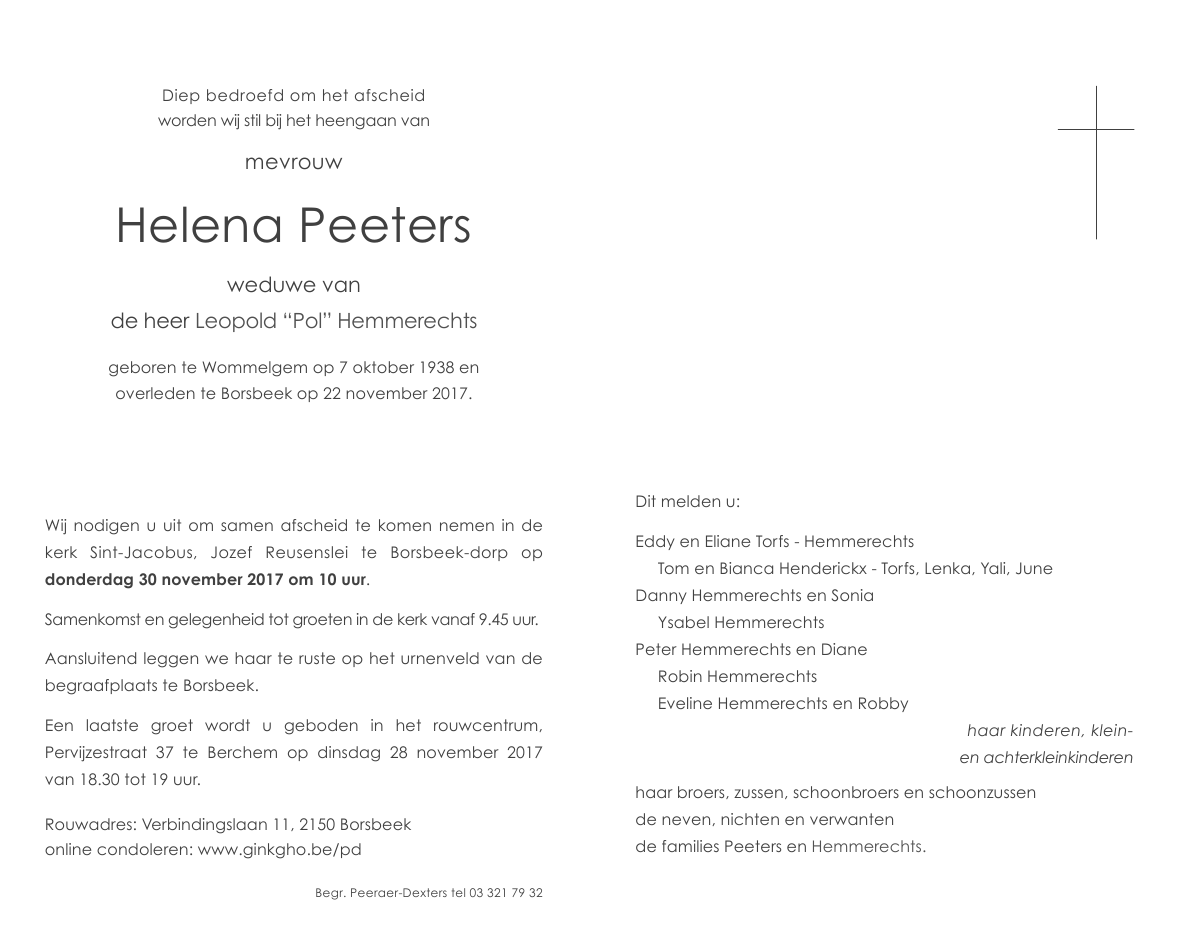 Overleden te Borsbeek (Antw.) (2150) op woensdag 22 november 2017 op 79-jarige leeftijd