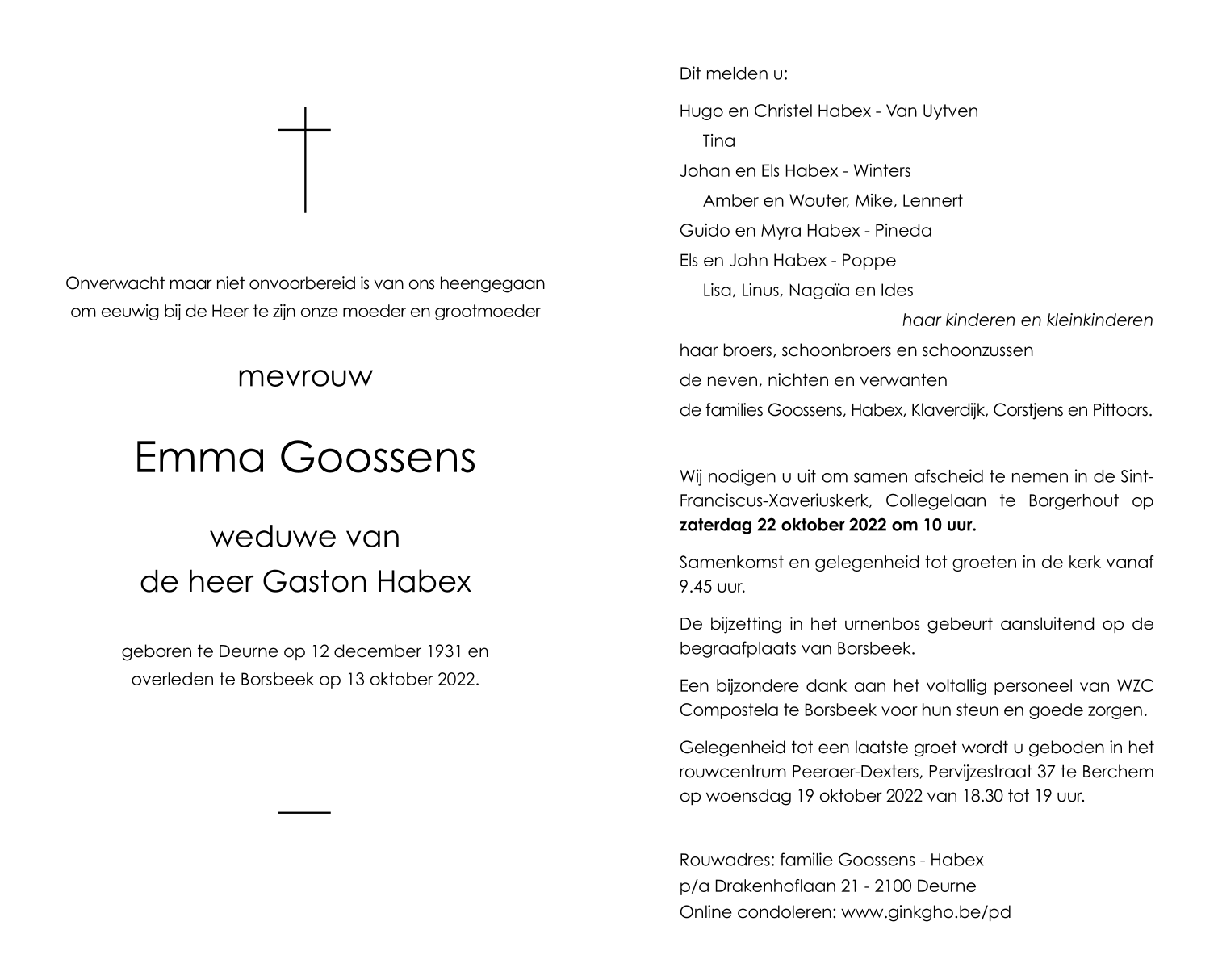 Overleden te Borsbeek (Antw.) (2150) op donderdag 13 oktober 2022 op 90-jarige leeftijd