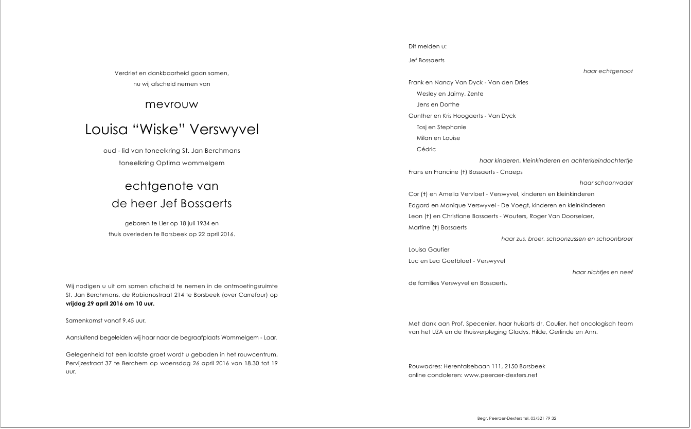 Overleden te Borsbeek (Antw.) (2150) op vrijdag 22 april 2016 op 81-jarige leeftijd
