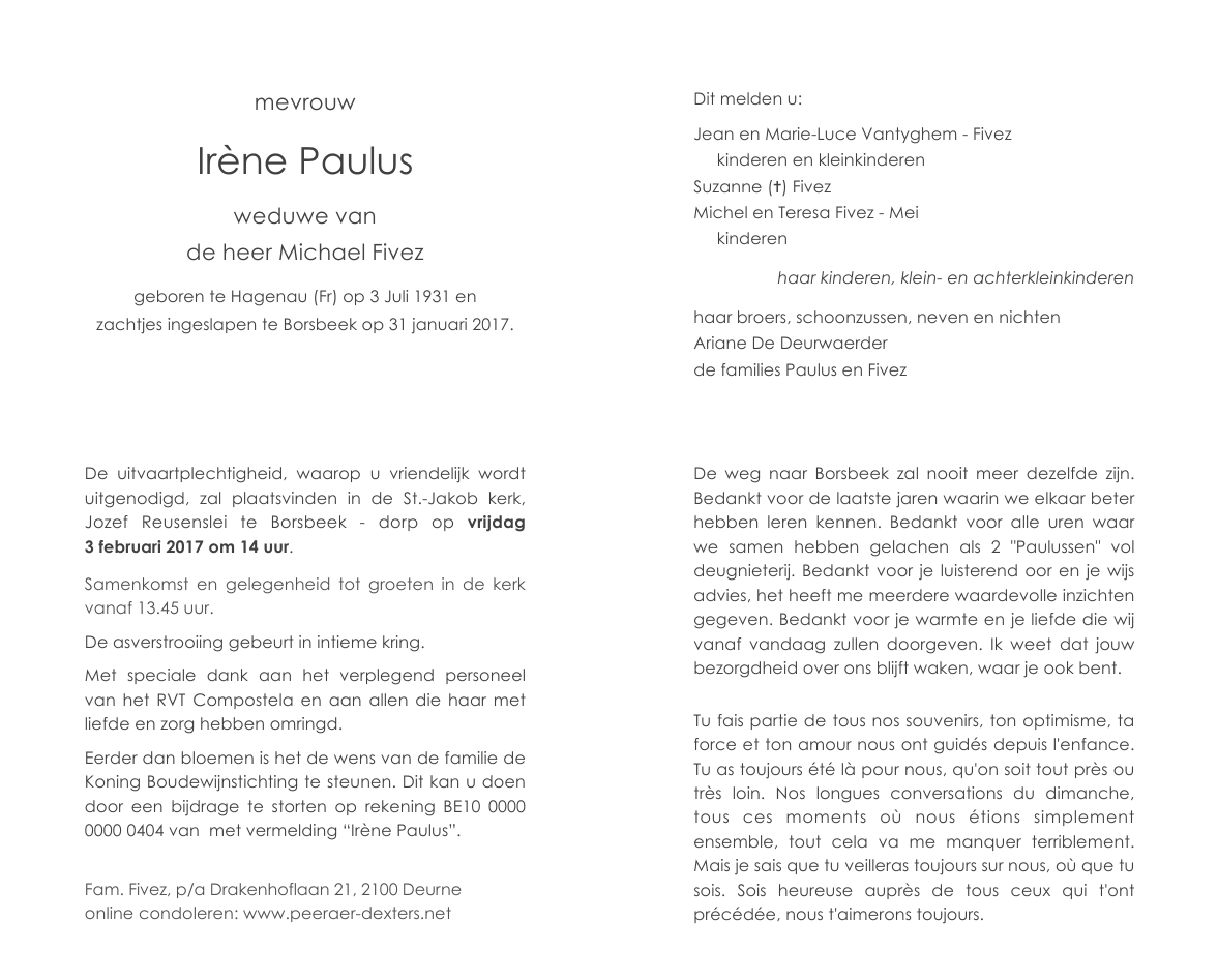 Overleden te Borsbeek (Antw.) (2150) op dinsdag 31 januari 2017 op 85-jarige leeftijd