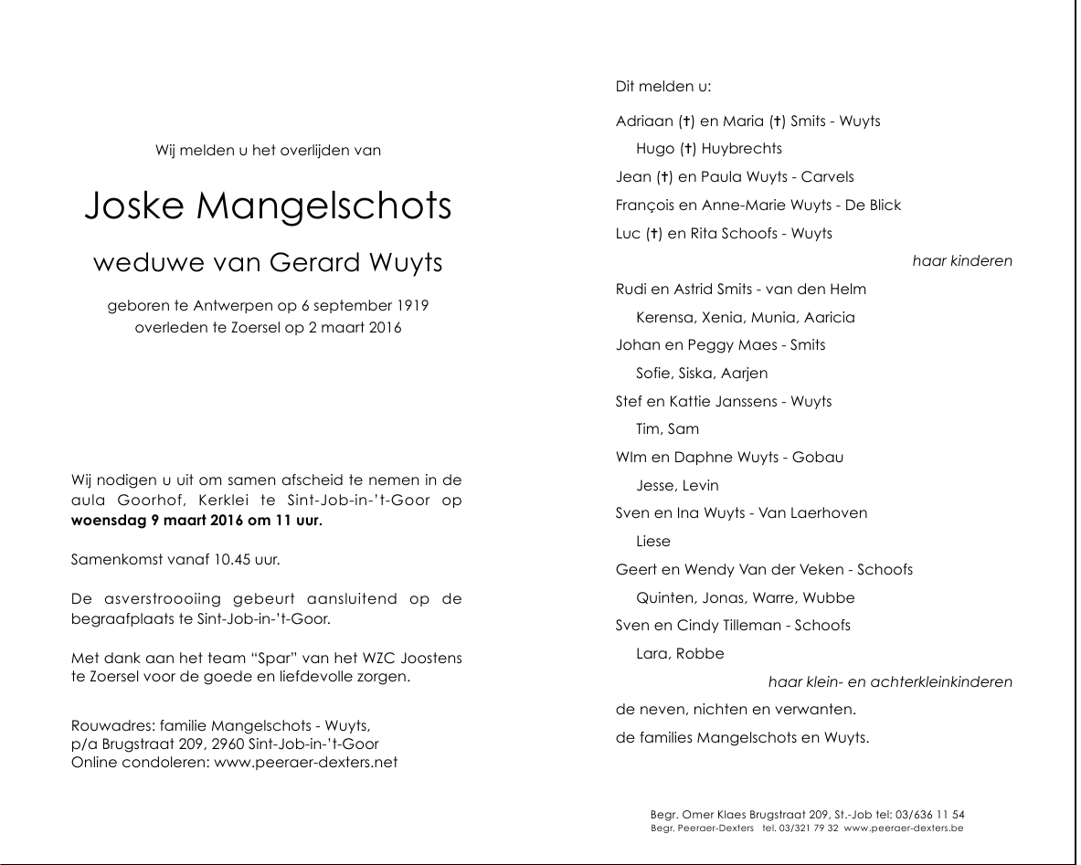 Overleden te Zoersel (2980) op woensdag 2 maart 2016 op 96-jarige leeftijd