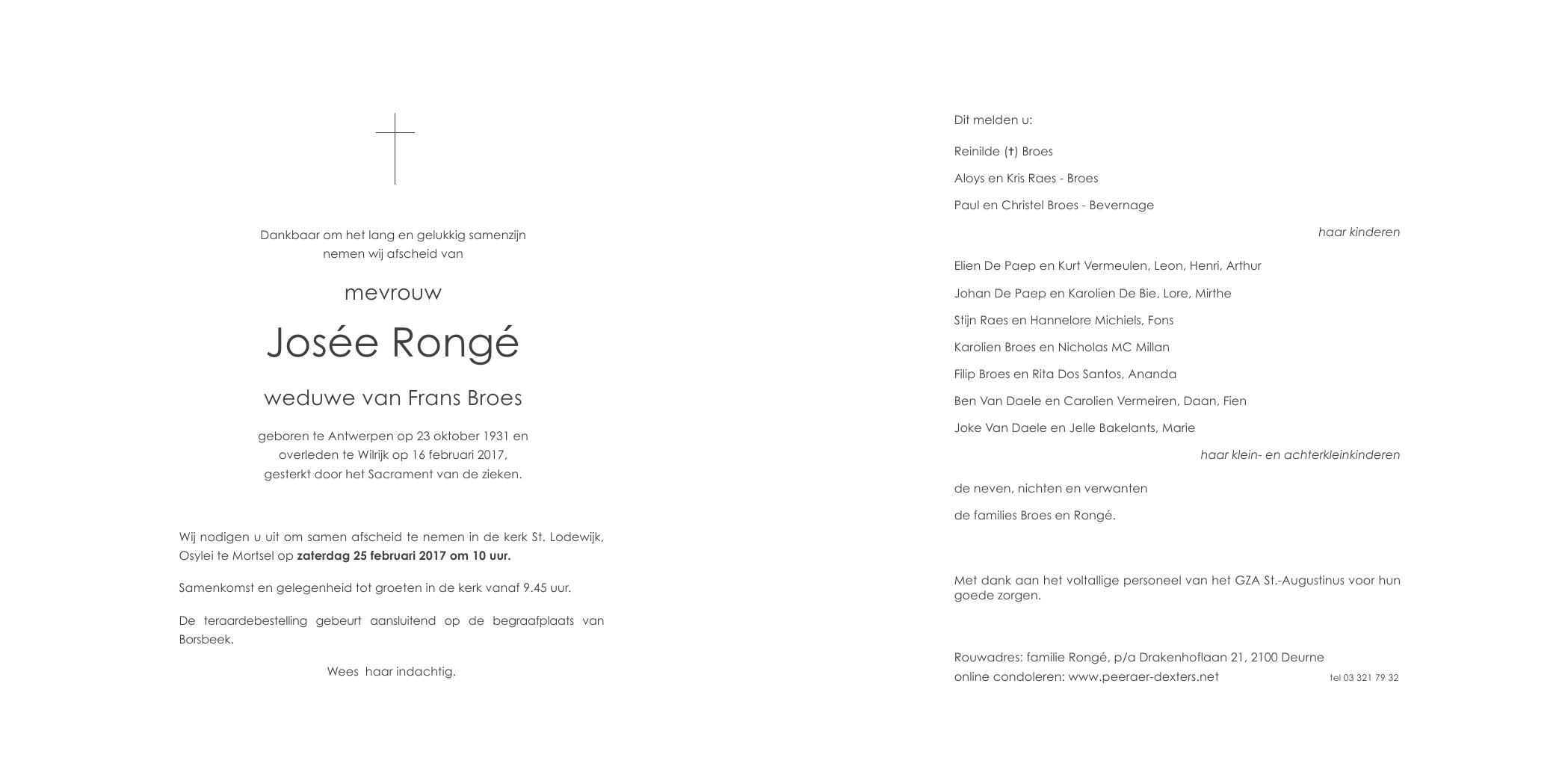 Overleden te Wilrijk (Antwerpen) (2610) op donderdag 16 februari 2017 op 85-jarige leeftijd