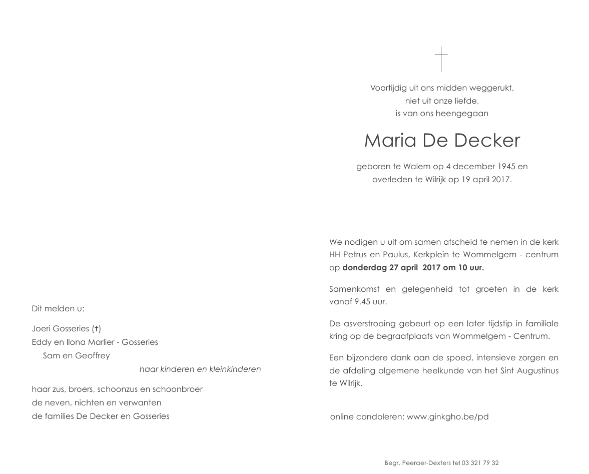 Overleden te Wilrijk (Antwerpen) (2610) op woensdag 19 april 2017 op 71-jarige leeftijd