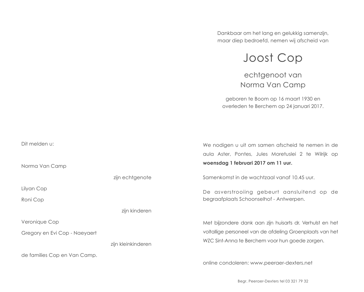 Overleden te Berchem (Antwerpen) (2600) op dinsdag 24 januari 2017 op 86-jarige leeftijd