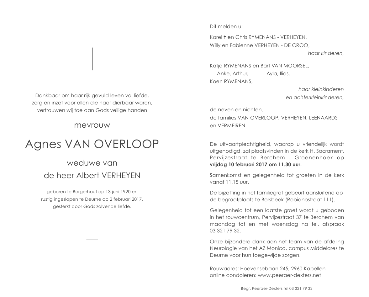 Overleden te Deurne (Antwerpen) (2100) op donderdag 2 februari 2017 op 96-jarige leeftijd