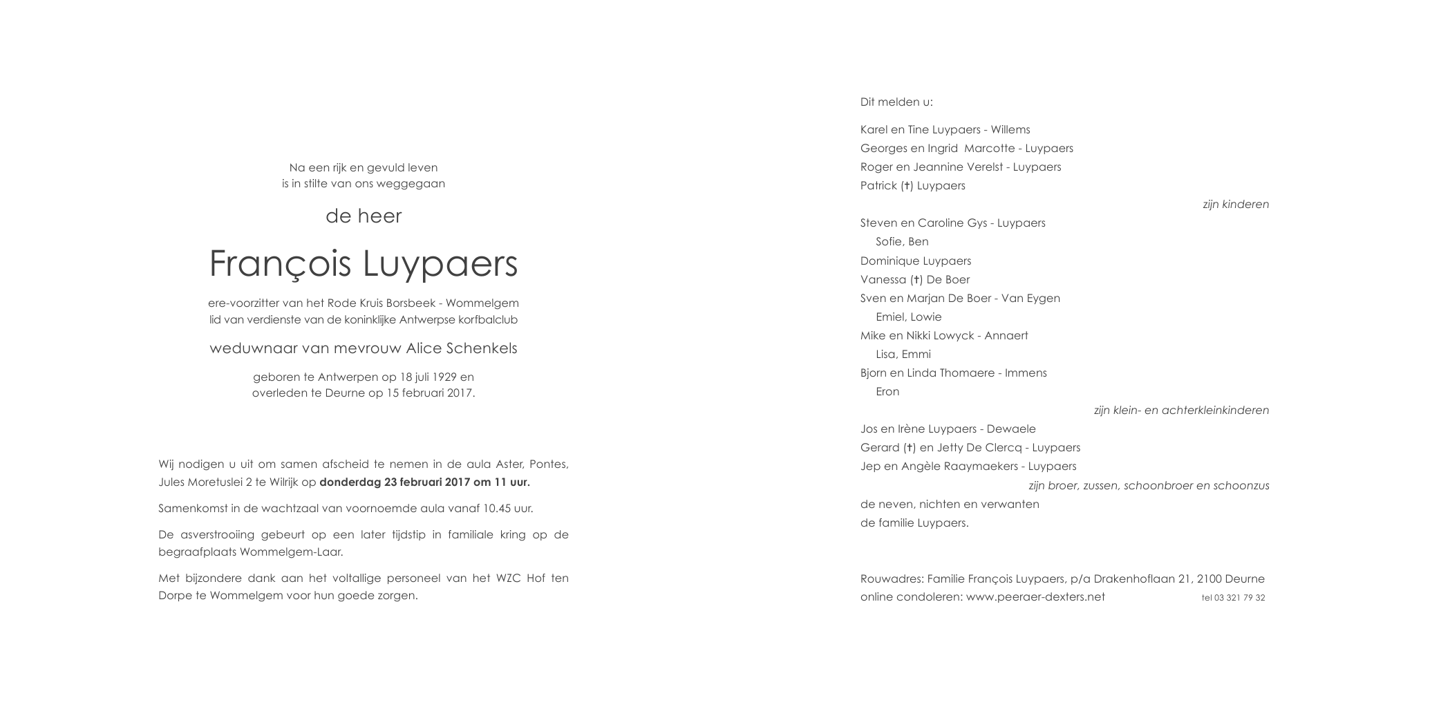 Overleden te Deurne (Antwerpen) (2100) op woensdag 15 februari 2017 op 87-jarige leeftijd
