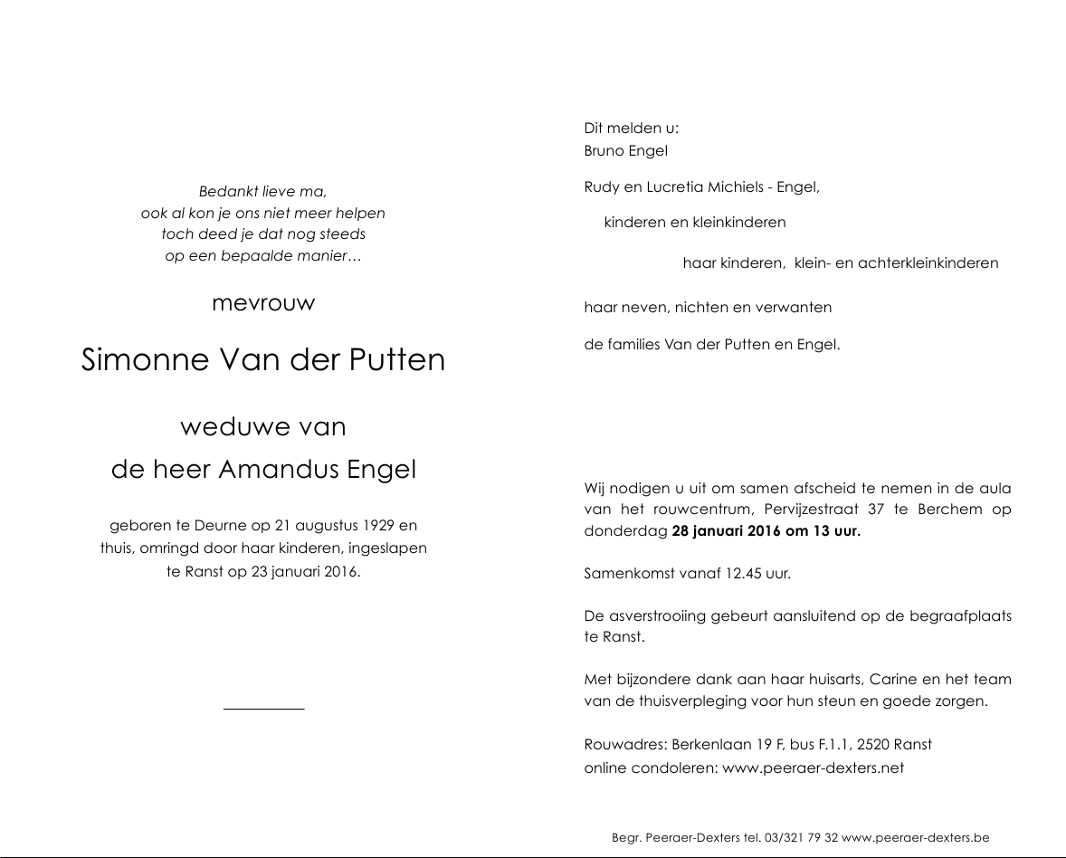 Overleden te Ranst (2520) op zaterdag 23 januari 2016 op 86-jarige leeftijd
