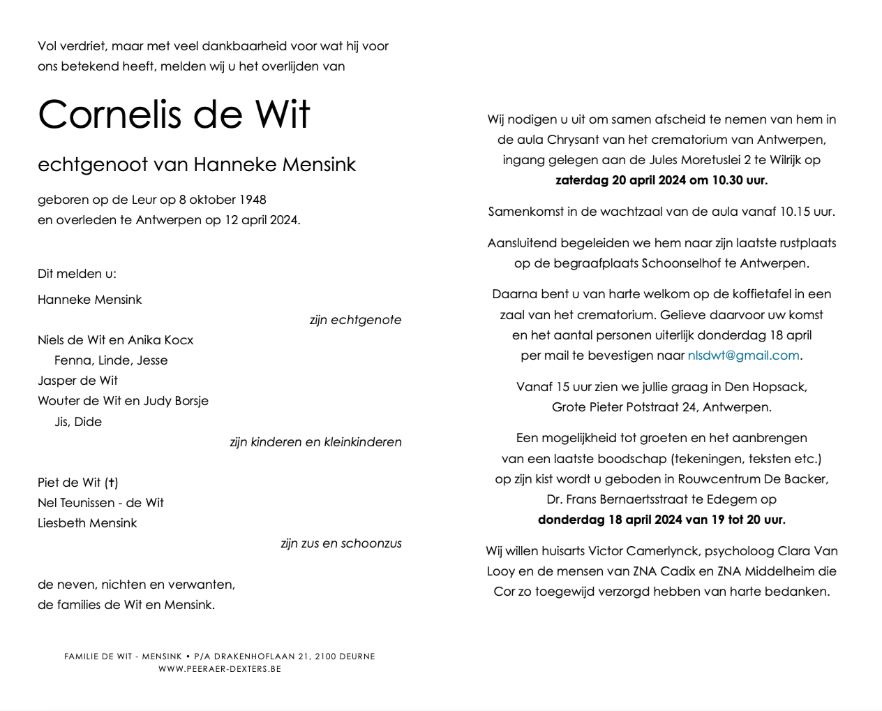 Overleden te Antwerpen (2020) op vrijdag 12 april 2024 op 75-jarige leeftijd
