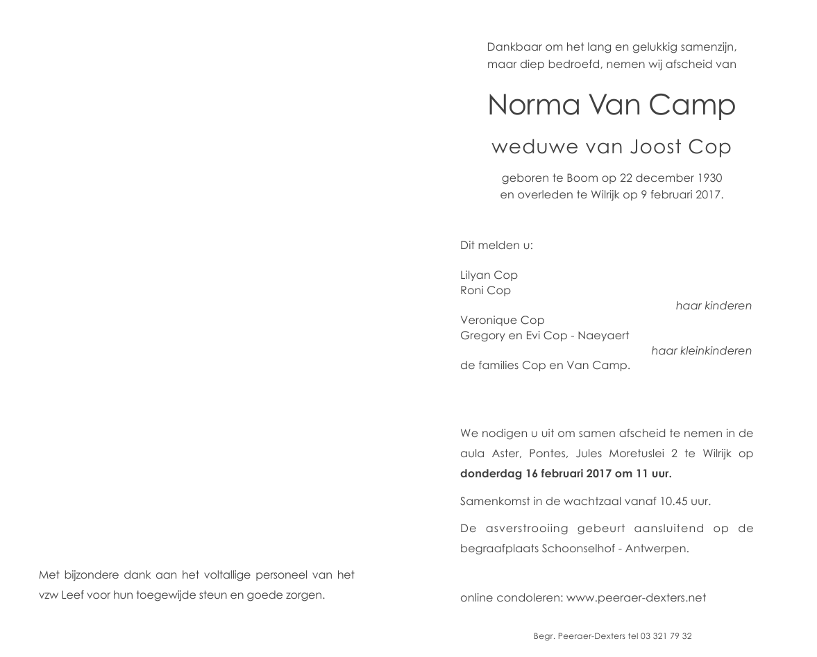 Overleden te Wilrijk (Antwerpen) (2610) op donderdag 9 februari 2017 op 86-jarige leeftijd