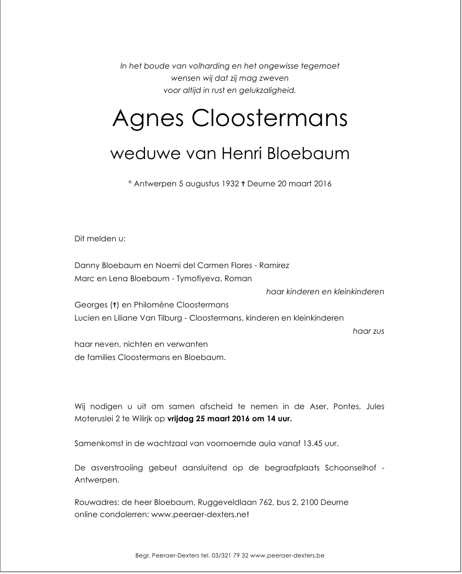 Overleden te Deurne (Antwerpen) (2100) op zondag 20 maart 2016 op 83-jarige leeftijd
