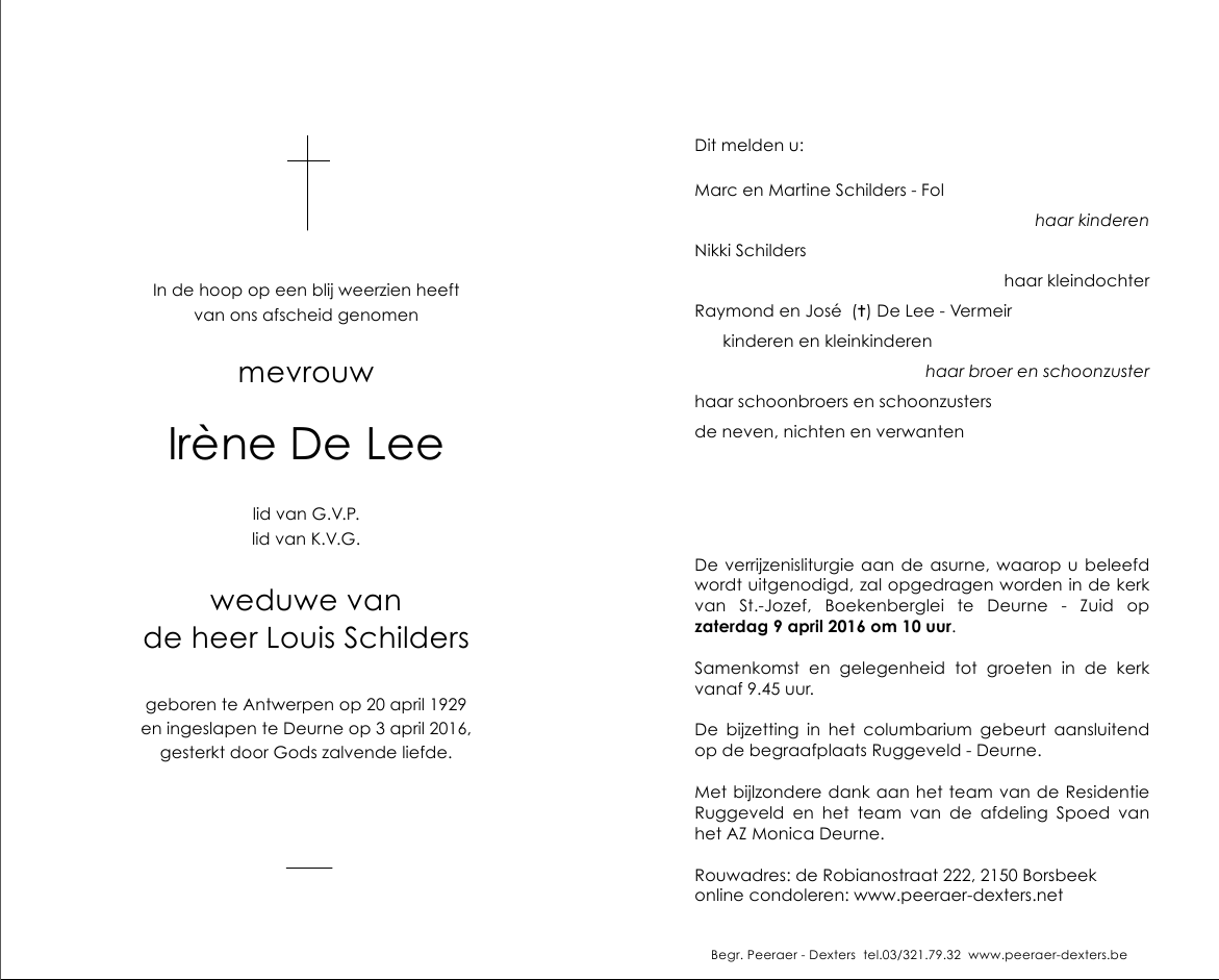 Overleden te Deurne (Antwerpen) (2100) op zondag 3 april 2016 op 86-jarige leeftijd