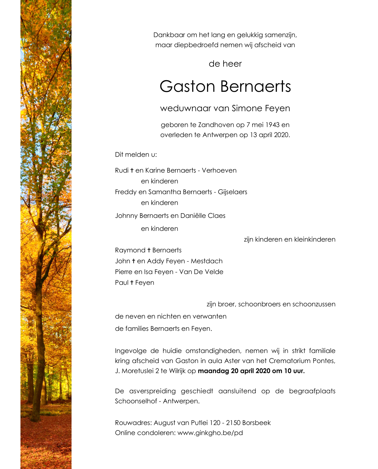 Overleden te Antwerpen (2000) op maandag 13 april 2020 op 76-jarige leeftijd