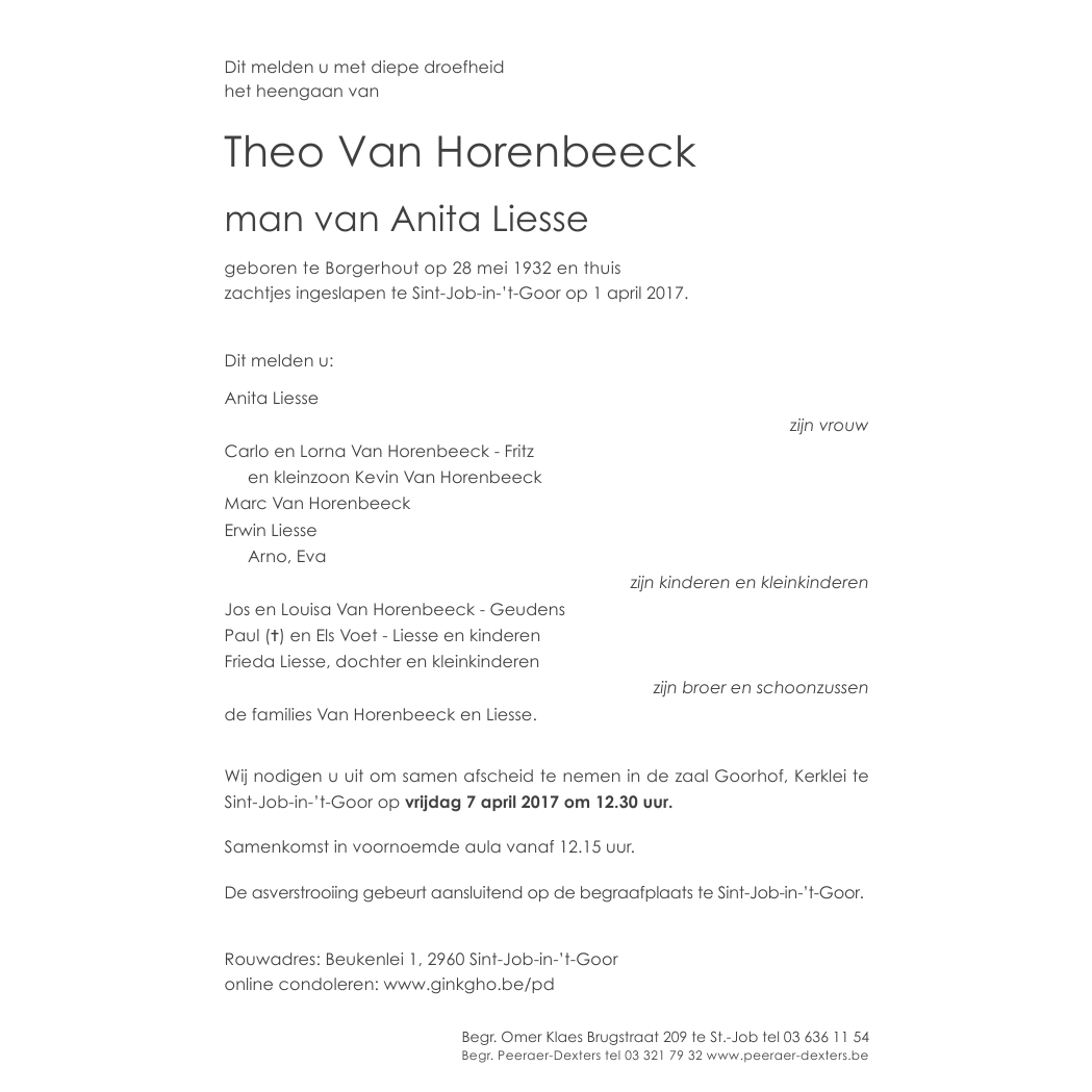 Overleden te Sint-Job-in-'t-Goor (2960) op zaterdag 1 april 2017 op 84-jarige leeftijd